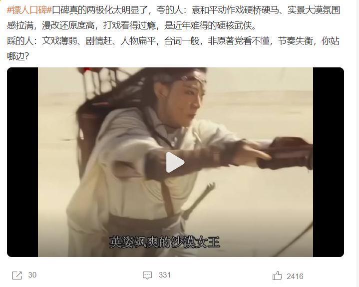 这样的情况出现,很多网友都忍不住问:还有必要看《镖人》吗?随后“镖人口碑”话题登上热搜,我们可以看到,网友们对这部电影的评价两极分化十分严重。