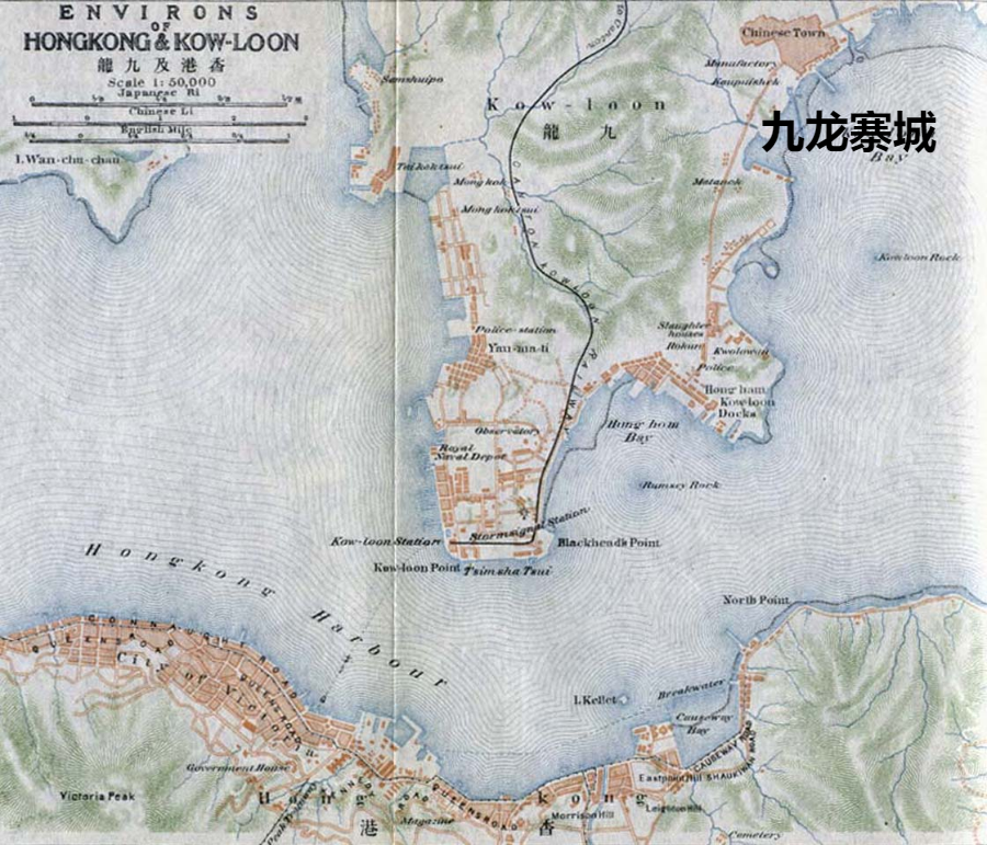 ▲英国割占的香港全图,其中“九龙”就是属中国的九龙寨城